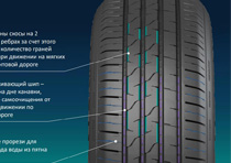 Уверенное поведение на мокрых дорогах и устойчивость к аквапланированию обеспечивают широкие центральные поперечные канавки протектора. По ним вода перенаправляется из пятна контакта, сохраняя устойчивость и отличный отклик на руление. Оптимизированное расположение элементов протектора и жесткие блоки обеспечивают стабильное поведение на сухих дорогах, прочное сцепление и отличную маневренность.